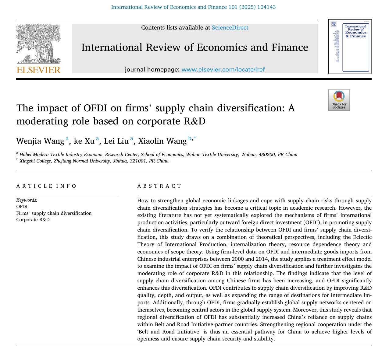 近日,英国365集团网站研究生许可在导师王文佳老师的指导下,在国际期刊International Review of Economics and Finance(《国际经济与金融评论》)合作发表题为“The impact of OFDI on firms’ supply chain diversification: A moderating role based on corporate R&D”(对外直接投资对企业供应链多元化的影响:基于企业研发的调节作用 )的学术论文。