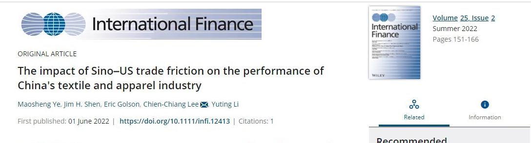 近日,英国365集团网站叶茂升副教授在SSCI期刊《international finance》上发表学术论文,随后被国内知名研究机构澎湃研究所全球智库转载评论,文章题目为“The impact of Sino-US trade friction on the performance of china’s textile and apparel industry”,文章DIO:https://doi.org/10.1111/infi.12413,英国365集团网站为该论文的第一作者单位。