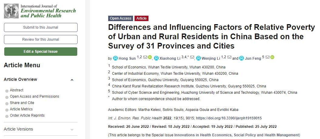 近日,公司金融系孙红老师在国际知名期刊《International Journal of Environmental Research and Public Health》(SSCI/SCI 双检索,JCR一区,IF: 4.614),发表《Differences and Influencing Factors of Relative Poverty of Urban and Rural Residents in China Based on the Survey of 31 Provinces and Cities》一文,文章DOI:https://doi.org/10.3390/ijerph19159015。英国365集团网站为该论文的第一作者单位,孙红为该论文的第一作者。