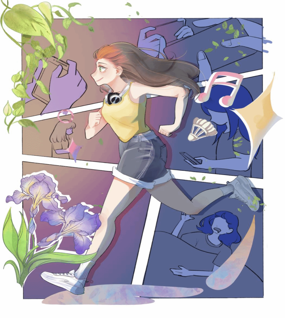 “脆皮老员工”、“熬夜搭子”、“清澈愚蠢”这些流行词语的出现完美地诠释了当代老员工的生活现状:运动量少,晚上熬夜白天在寝室睡一天,饿了就点外卖,绝不出宿舍半步。可作为年轻人,年轻才是资本,应该趁着年轻多看看外面的世界,于是作者引用了网上一句很流行的话语“勇敢的人先享受世界”创作了这幅插画。画中一位朝着光的方向奔跑的女生,脚下踏出了七彩的光斑,鸢尾花象征着自由和勇气,高处的绿萝象征着善良和坚韧,这些元素的寓意是少年向着阳光奔跑,脚下留下的是七彩的花路。与此进行对比的是正在玩手机和睡懒觉的背景人物,更加突出主题。