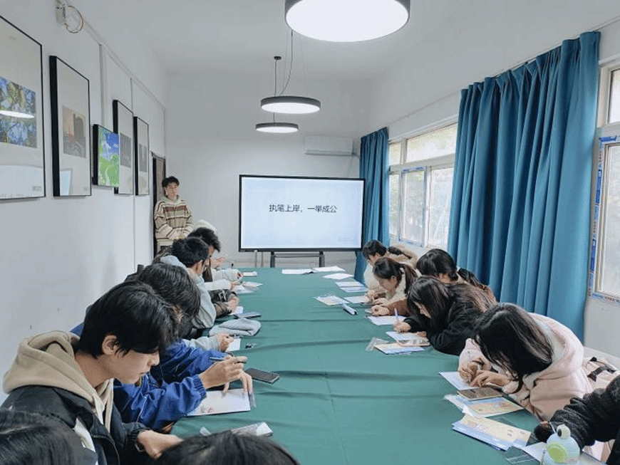 11月26日中午,在十二栋二楼红色先锋党员服务工作站,成长服务部干事们怀揣着真诚的祝愿,精心设计制作出了一张张饱含深情的祝福卡片。一笔一划中流露出的是对考公学子们殷切的期许与热切的展望,也是从“岁月不负少年意,旗开得胜终有时”的激昂期许,到“心怀锦绣展宏图,青风直上步云霄”的壮志豪情,字字句句满是关怀。