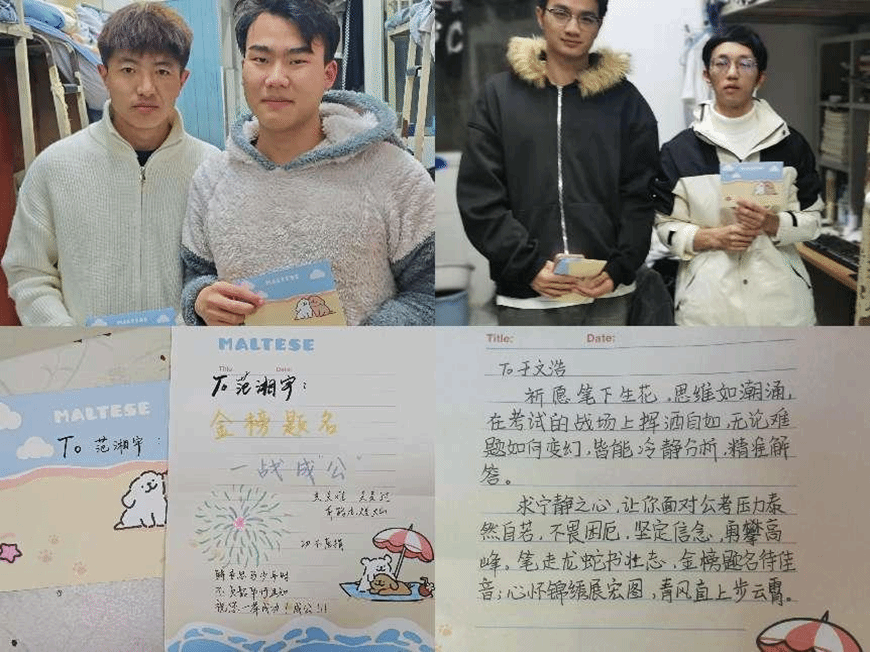 11月29日晚,写好的卡片由成长服务部干事细心分拣,走进宿舍,将这份温情传递到考公同学的手中,保证每一位考公学子能够感受到公司的温暖。卡片上的“加油,愿你金榜题名!”以及“这次一定成‘公’!”等话语激励着每一位考公学子。在这寒冬的冬天,温暖着每一个人的心,激励着每一位学子!