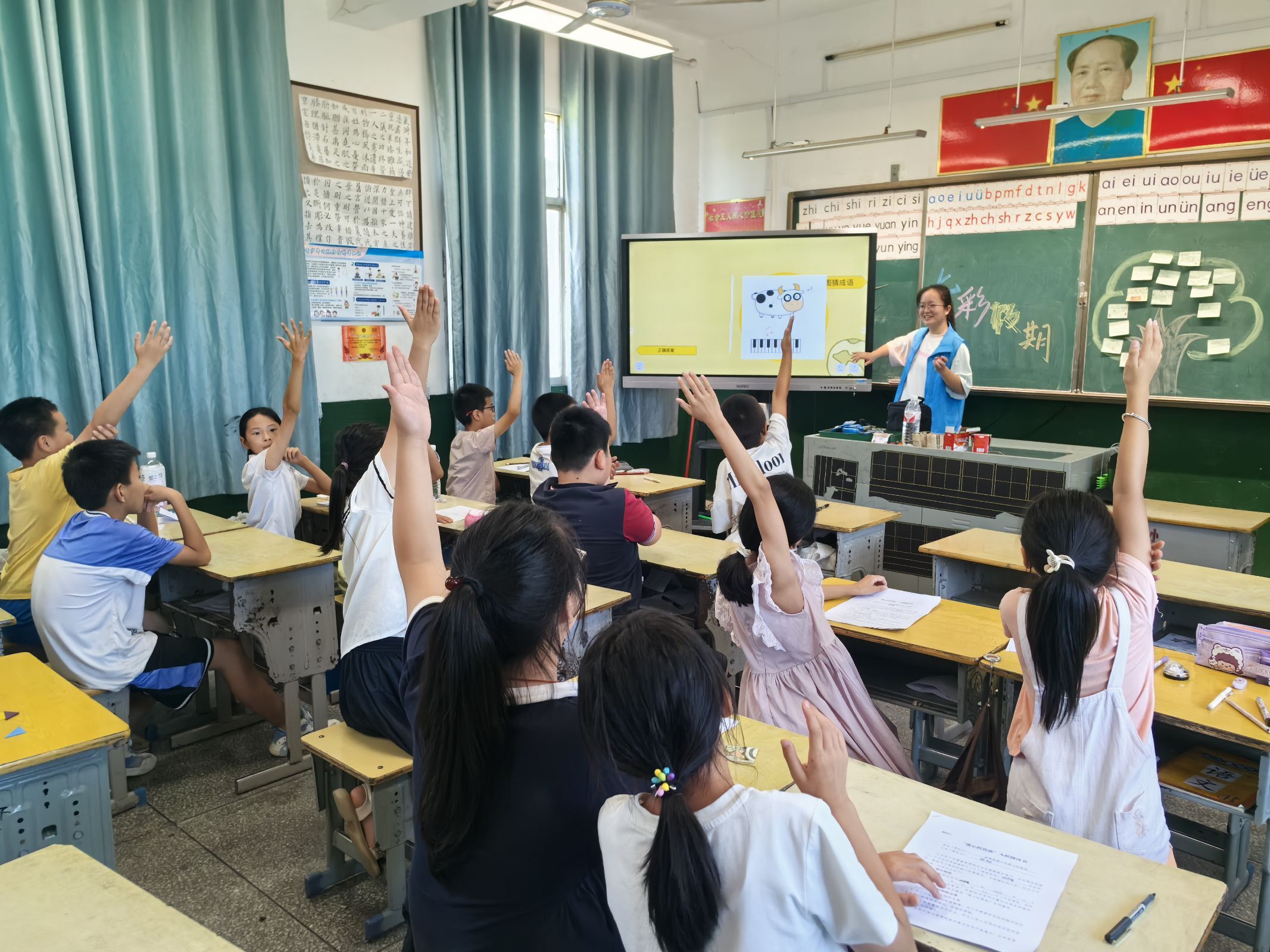 稍作休整后,队员们迅速投身工作,分别前往金海希望小学、斗山村、涂山镇进行教学。队员们以生动有趣的方式自我介绍,分享自身专长与对支教的期待,瞬间点燃了孩子们的热情。为增进彼此的感情,营造活跃的学习氛围,队员们精心筹备了趣味游戏环节。“自画像”活动让孩子们充分发挥想象力,用五彩画笔勾勒出心中的自己。在金海希望小学,“看图猜成语”游戏让现场热闹非凡,孩子们踊跃抢答,积极展现知识储备,稚嫩的声音此起彼伏。斗山村的课堂上, “找不同”深受孩子们喜爱。大家全神贯注紧盯图片,仔细寻找每一处差异。涂山镇教学点巧用“击鼓传花”,鼓励拿到“花”的小朋友大方上前,表演节目,活动气氛热烈,笑声不断。在游戏过程中,支教队员巧妙融入安全知识普及,结合游戏画面讲解交通安全、防溺水等知识,让安全教育变得生动有趣。