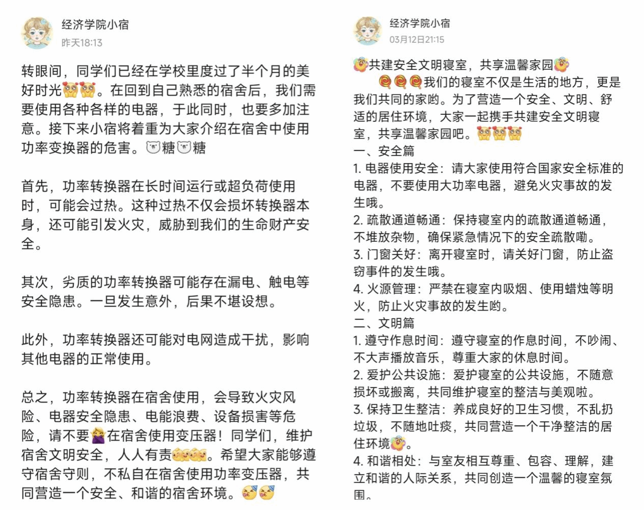 此外,成长服务部还充分利用小宿官Q等社交媒体平台,多次向员工们推送寝室违规电器科普小贴士。这些小贴士内容丰富、形式活泼,旨在鼓励全体员工积极参与宿舍文明建设,共同为打造一个文明、安全、和谐的宿舍环境贡献力量。