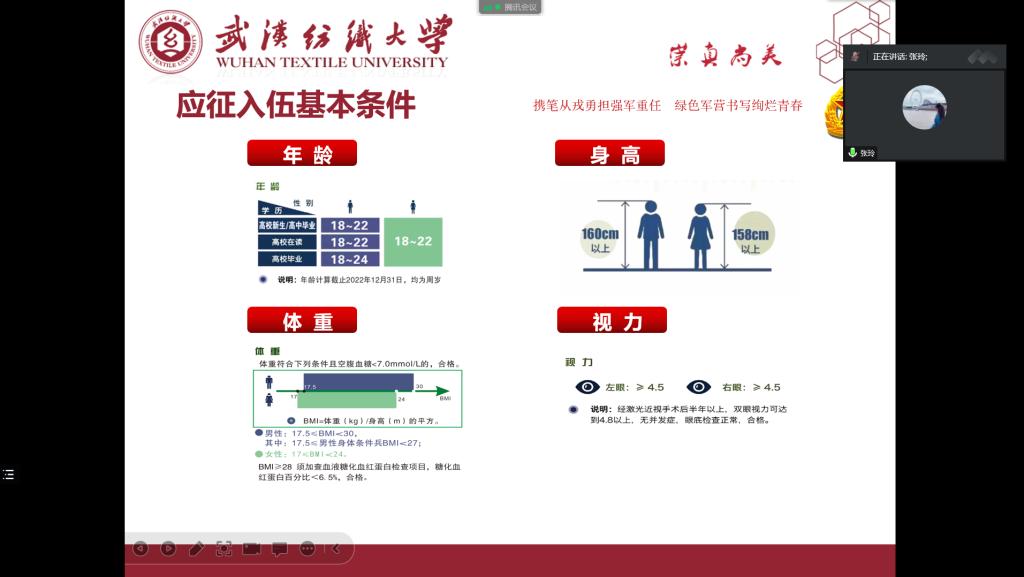 会议伊始,辅导员、班主任就2023年春季老员工征兵入伍相关工作进行详细讲解,从征兵入伍基本信息、老员工参军特别优惠政策、军营生活、征兵防诈骗等四个方面鼓励老员工积极响应征兵号召,并动员同学们积极参与。