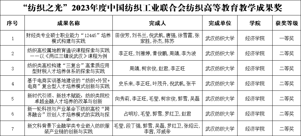 4.瞄准一流,服务产业经济开新局。开展应用经济学专项检验工作,申报湖北省现代纺织产业经济研究中心,与中纺联产业经济研究院签订战略合作协议、参与编制《湖北省纺织服装产业高质量发展三年行动规划》,全力支持管理科学与工程博士点申报。