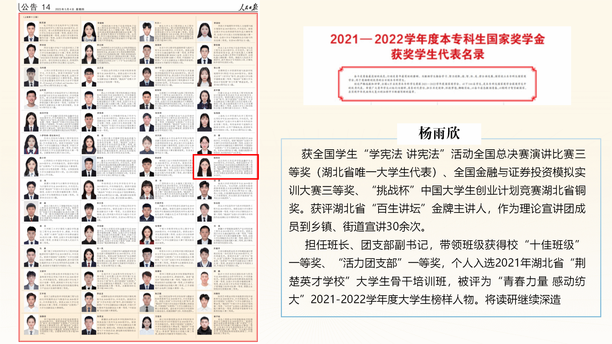 7.知行合一,育人工作再添新亮点。杨雨欣入选《人民日报》国家奖学金获奖员工代表名录;22名毕业生考取公务员、选调生、西部计划、三支一扶;升学率25.65%,较上年提升8.34%,出国留学16人;“青春护农”实践队获省部级荣誉5项。